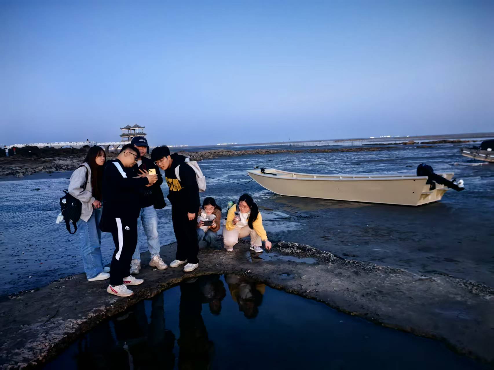 27日,天堂滩日出与滩涂光影成为拍摄重点,学生练习逆光与动态捕捉技巧;下午走进京族博物馆,聚焦哈节、独弦琴等非遗文化,留存民族特色影像。