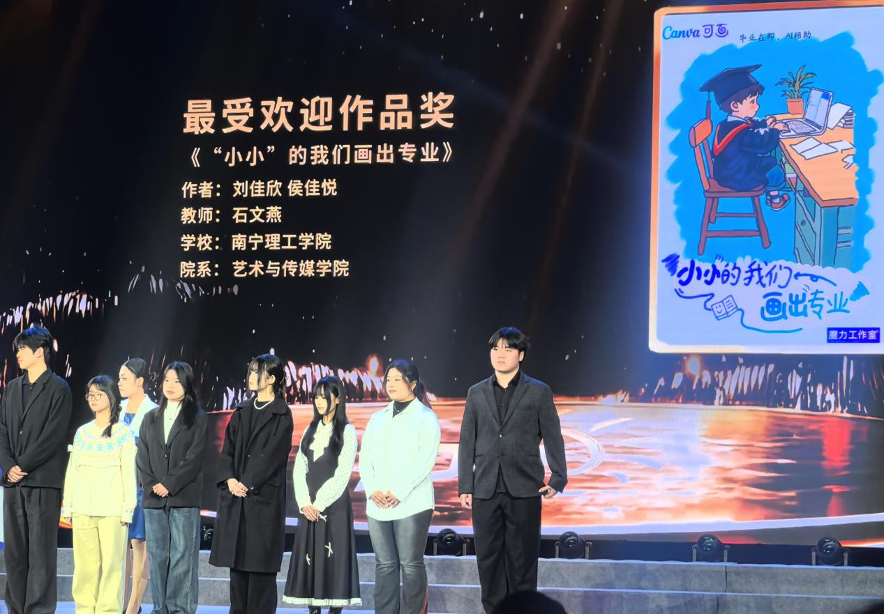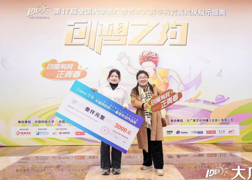 近日,第17届全国大学生广告艺术大赛学科竞赛成果展示盛典暨20周年华彩盛典在北京全国政协大礼堂举行,南宁理工学院艺术与传媒学院广告学专业刘佳欣同学的作品《小小的“我们”画出专业》荣获企业特别奖,并受邀上台领奖。此次活动由新视界设计产业学院组织。