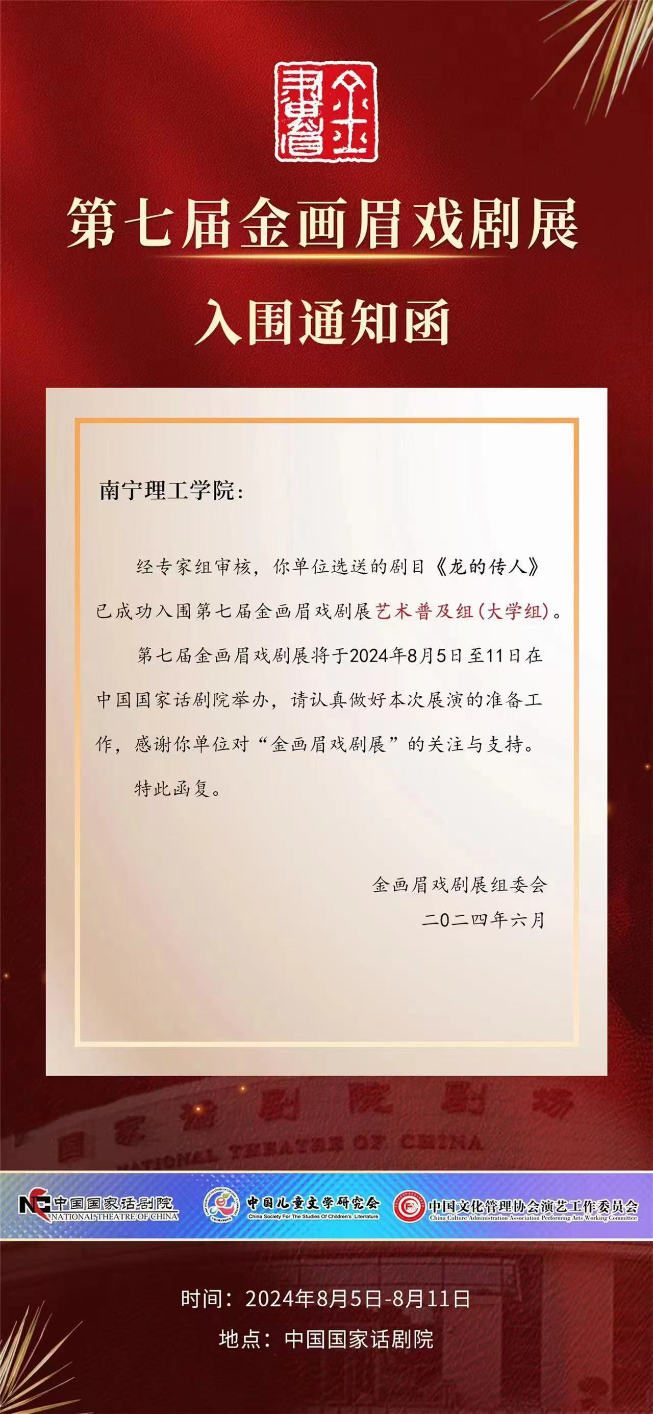 8月5日至11日,在微影星火数字传媒产业学院的大力支持下,艺术与传媒学院表演专业教师韦永红、袁方带领9名学生前往北京参加“第七届金画眉戏剧展”。此展由中国国家话剧院举办。我院选送的原创剧目《龙的传人》(成员:刘浩、刘成林、马瑞、张颢泷、王大志);改编剧目《离婚指南》(成员:崔朔、吴怡蓉)成功入围第七届金画眉戏剧展艺术普及组(大学组)。