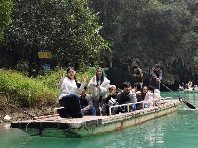 实训第二站,师生一行来到河池三门海地质公园。置身于独特的喀斯特地貌与地下河景观之中,学生们采集水流、风声、鸟鸣等自然音效,围绕地质科普主题完成短片配音。通过此次实践,学生们有效锻炼了在开放户外环境中,根据声场变化灵活调整语速、语调和情感表达的配音掌控能力。