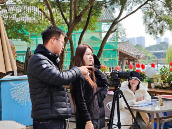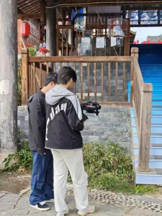 广播电视编导专业学生正在小镇内进行取景与拍摄