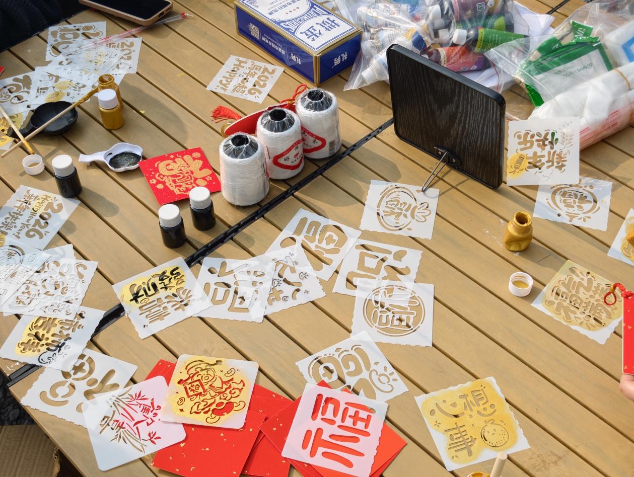 在福字拓印区,大家手持海绵拓印拍,蘸取金墨均匀轻拍,红底金字的福字跃然纸上,一笔一画皆是祝福;在瑞兽挂饰创作区,扇形与方形纹样模板搭配流苏、铜铃,大家发挥艺术创意,将瑞兽纹样与福字巧妙结合,制作出兼具装饰性与纪念意义的新春挂饰。指尖轻触间,传统技艺与现代审美碰撞融合,每一件作品都承载着对生活的热爱、对节日的礼赞,尽显艺传学院女性的巧思与才情。