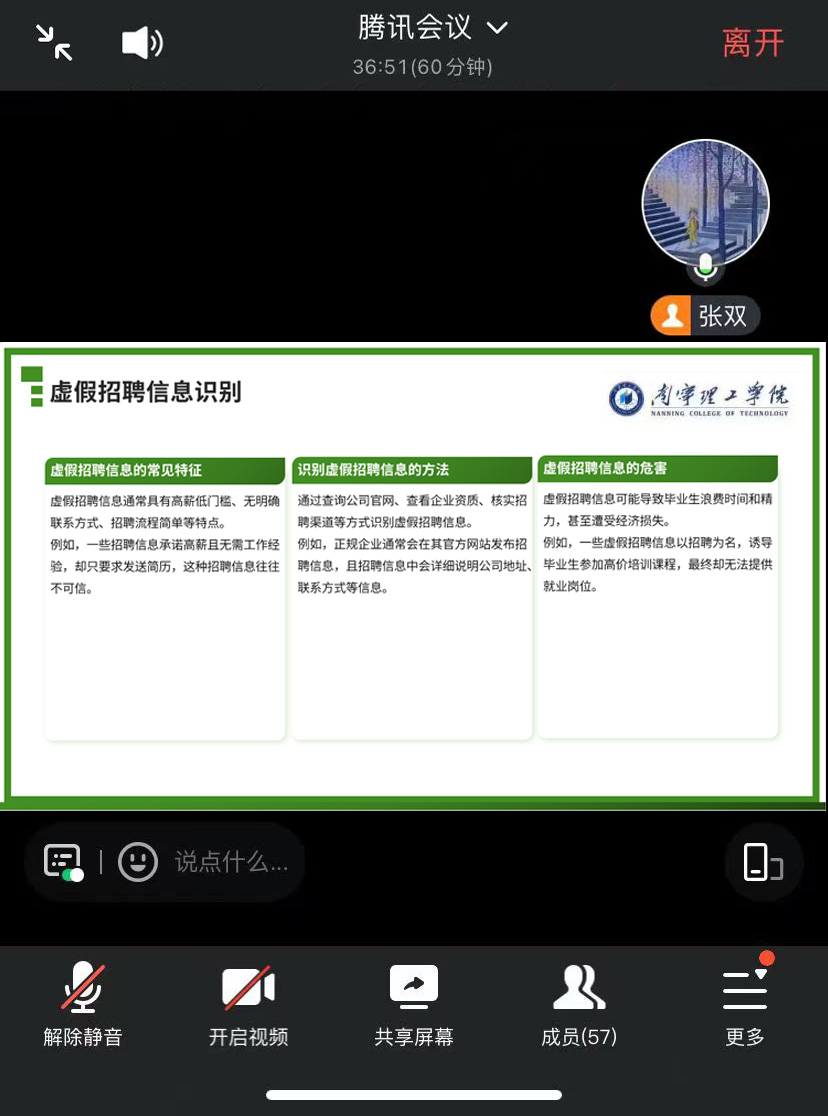 此次班会,不仅是一堂及时的求职风险“预警课”,更是艺术与传媒学院深入践行“以生为本”教育理念的生动体现。通过系统化、常态化的安全宣教,提升毕业生的自我保护能力,为毕业生从容应对职场挑战奠定坚实基础。