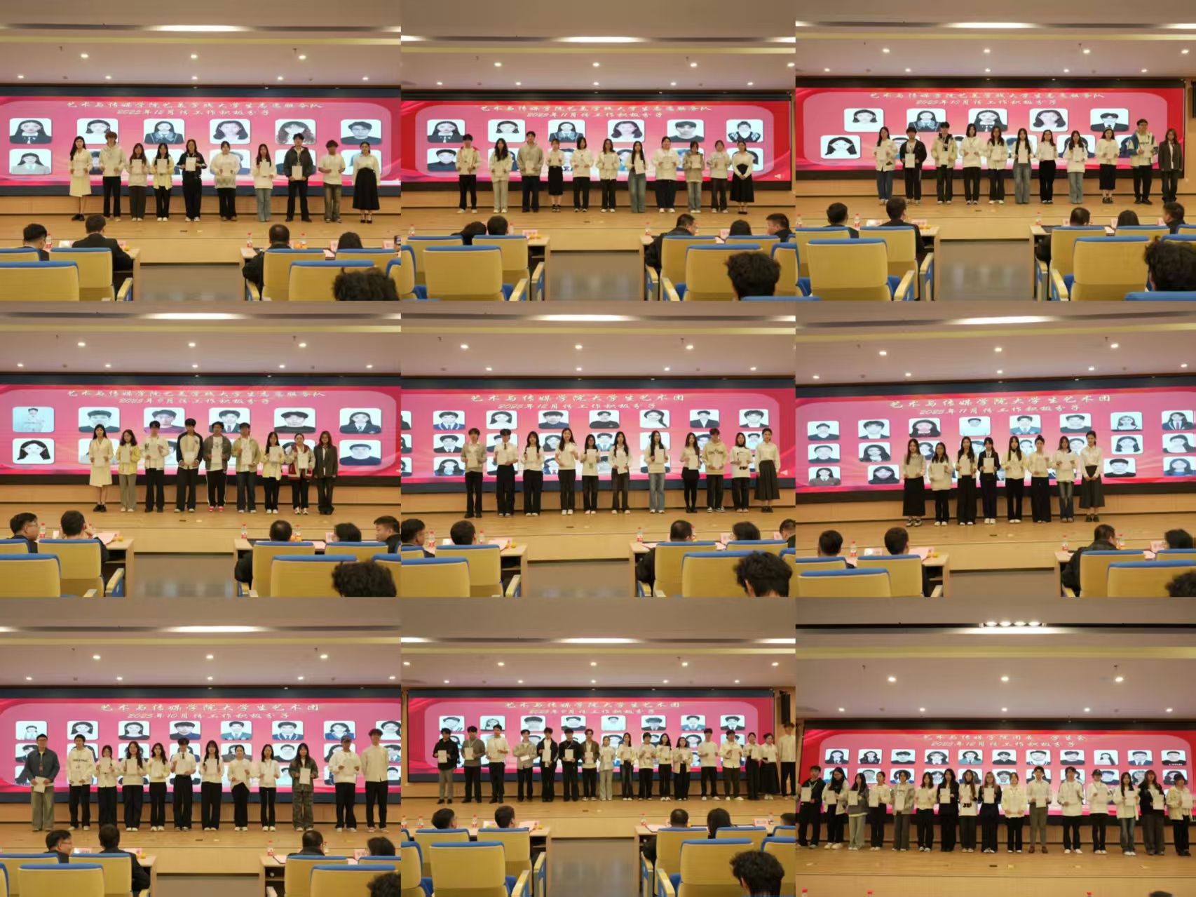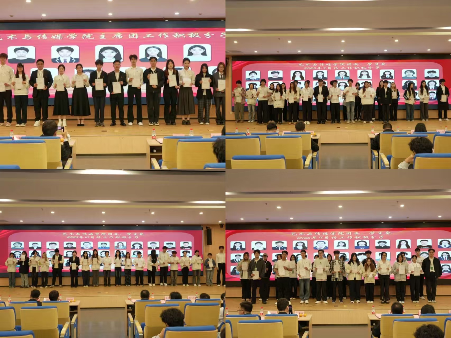 在激昂的乐曲与热烈的掌声中,表彰环节正式开始。艺术与传媒学院团委学生会、大学生艺术团、艺美学践大学生志愿服务队的优秀学生干部骨干依次上台,接受学院授予的荣誉证书。这份表彰,是对过往辛勤耕耘的至高肯定,更是激励全体学子见贤思齐、奋发向上的精神火炬。