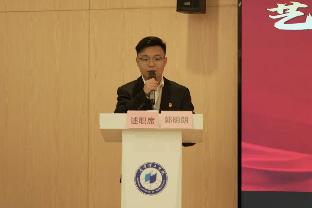 最后,学院艺美实践大学生志愿服务队主席郭明郎上台述职。他聚焦“以艺助人,以美育人”的宗旨,生动讲述了服务队深入社区、乡村开展美育支教、公益墙绘等志愿服务的故事,彰显了艺传学子将专业技能转化为社会服务的责任与担当。