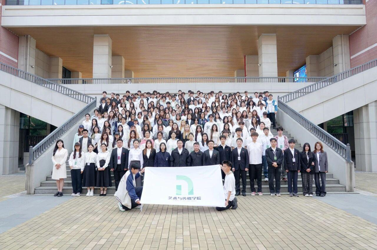 全体与会师生移步阶梯前,合影留念。镜头定格下灿烂的笑容与昂扬的姿态,也定格了艺术与传媒学院学生组织团结一心、追求卓越、锐意进取的集体精神风貌。