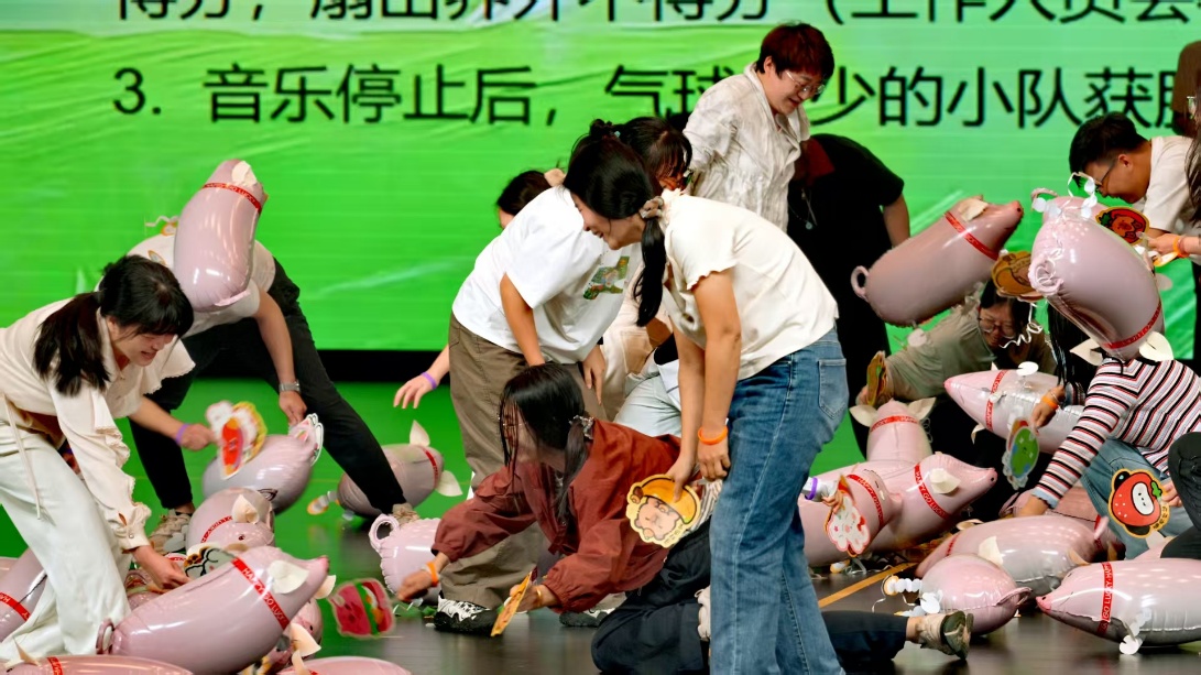 音乐响起,扇子翻飞、气球飘舞,场面十分热闹。平日里严谨认真的辅导员们彻底放下拘谨,或蹲或跳、或攻或守,全情投入这场“气球保卫战”,音乐骤停后,工作人员统计各格子气球数量,按气球多少排名积分。