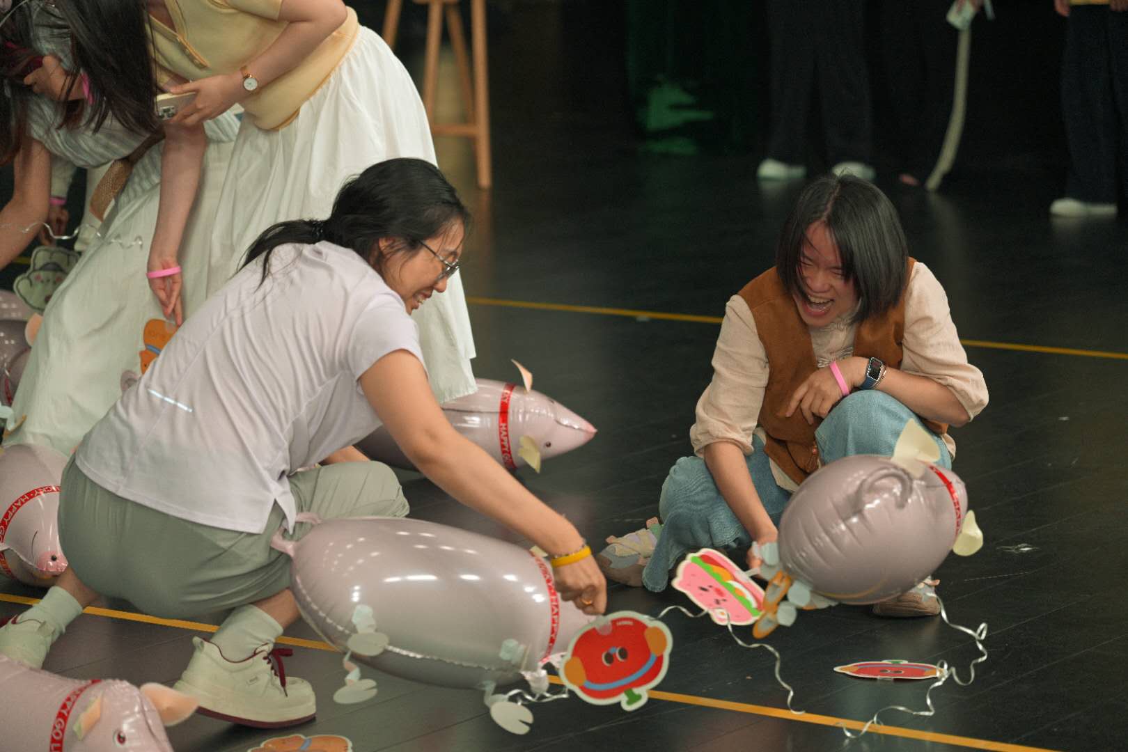 如果说前两个游戏考验的是默契与脑力,那么“猪兔赛跑”则是一场纯粹的欢乐释放,严格遵循活动方案设置,工作人员提前用胶带标记出3×3九宫格,为每组发放扇子和小猪气球,明确“只能用扇子扇动气球、不能用身体直接触碰”的规则。