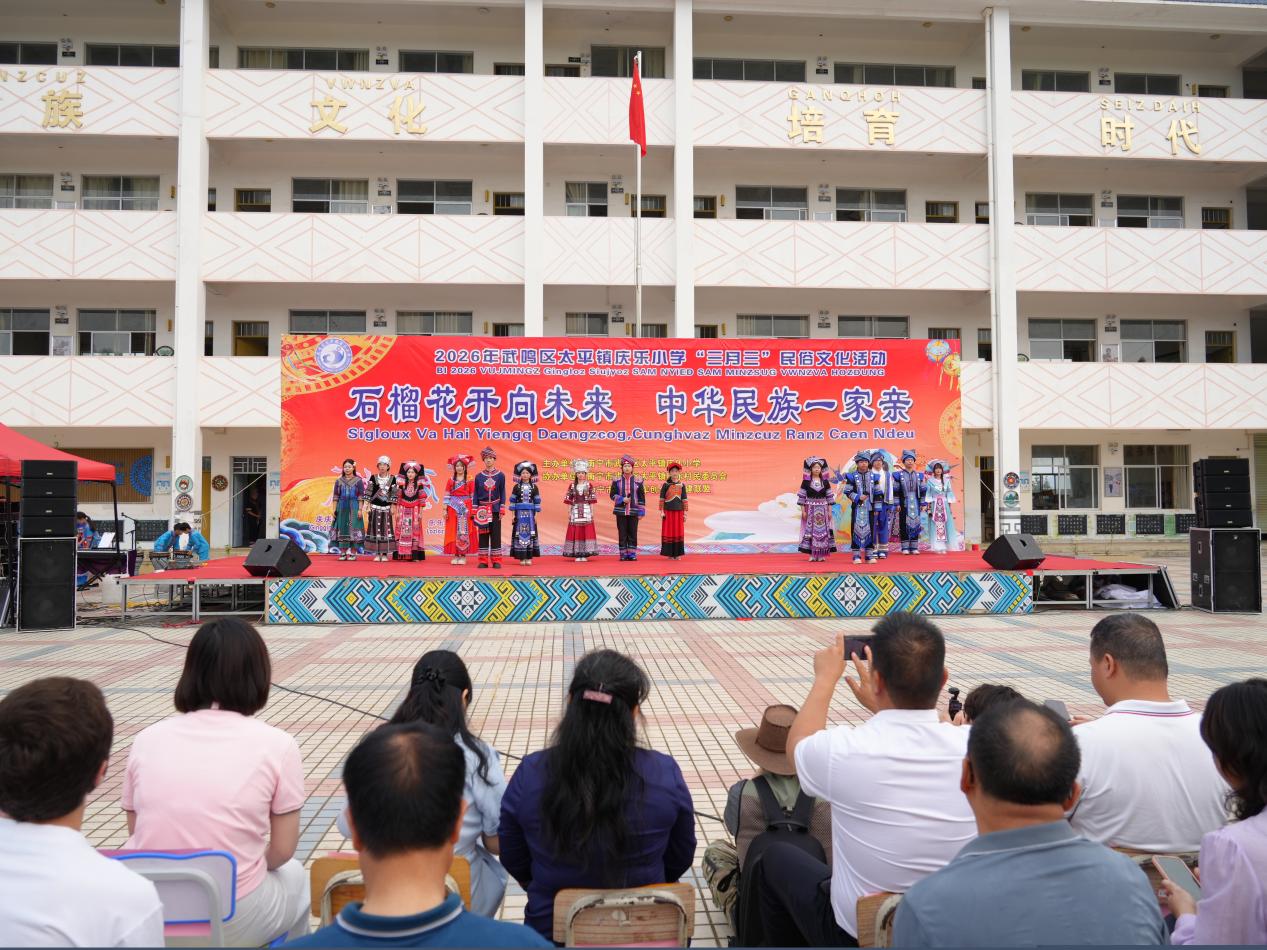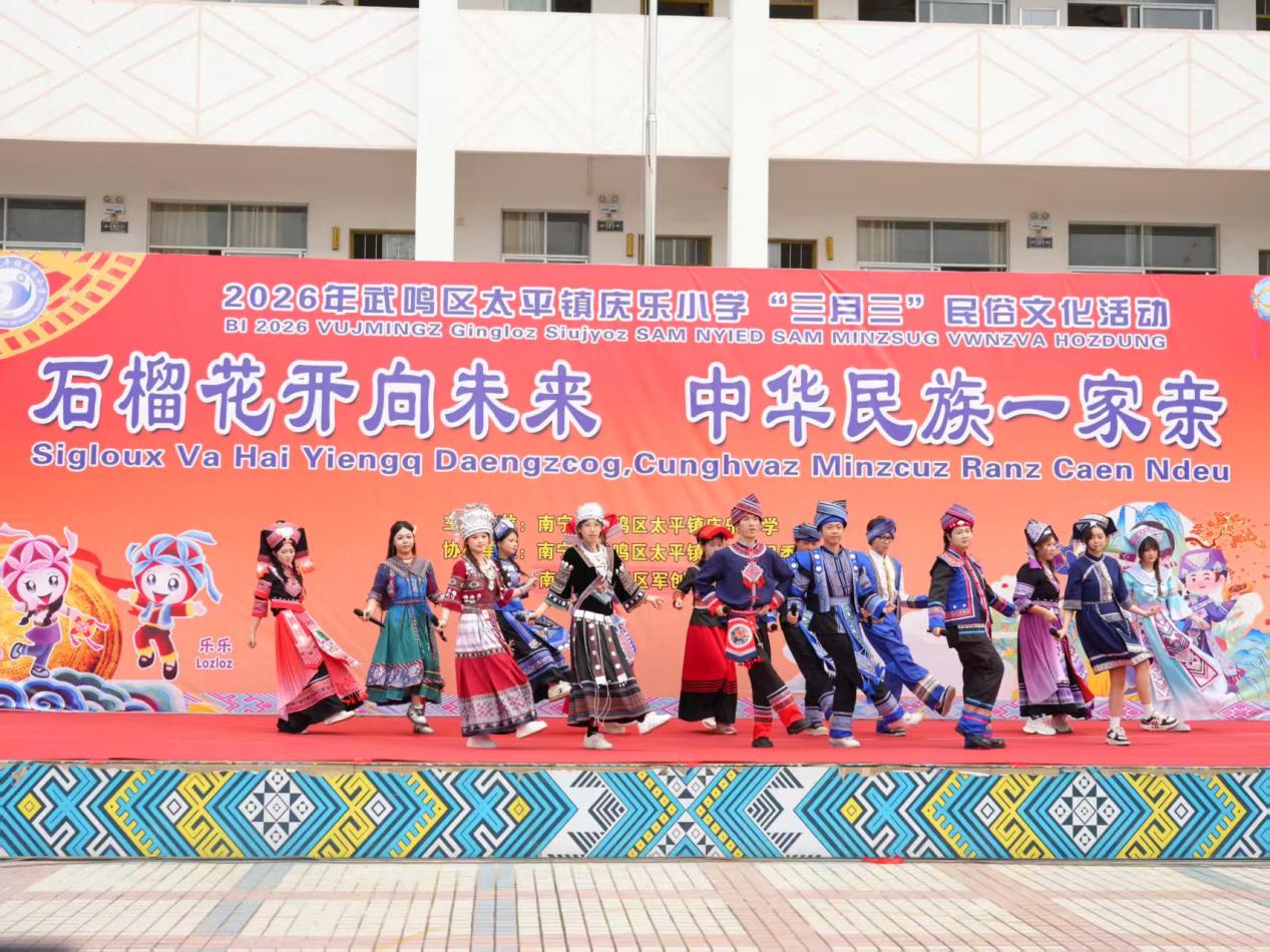 4 月 16 日,学院组织师生走进武鸣区太平镇庆乐小学,协办 "石榴花开向未来,中华民族一家亲"2026 年三月三民俗文化活动。作为活动核心环节,学院大学生艺术团献上主题朗诵表演,围绕 "民族团结"" 民俗传承 " 两大主题,以饱含深情的语言传递中华民族一家亲的理念,在孩子们心中播撒下民族团结的种子,赢得全校师生热烈掌声。