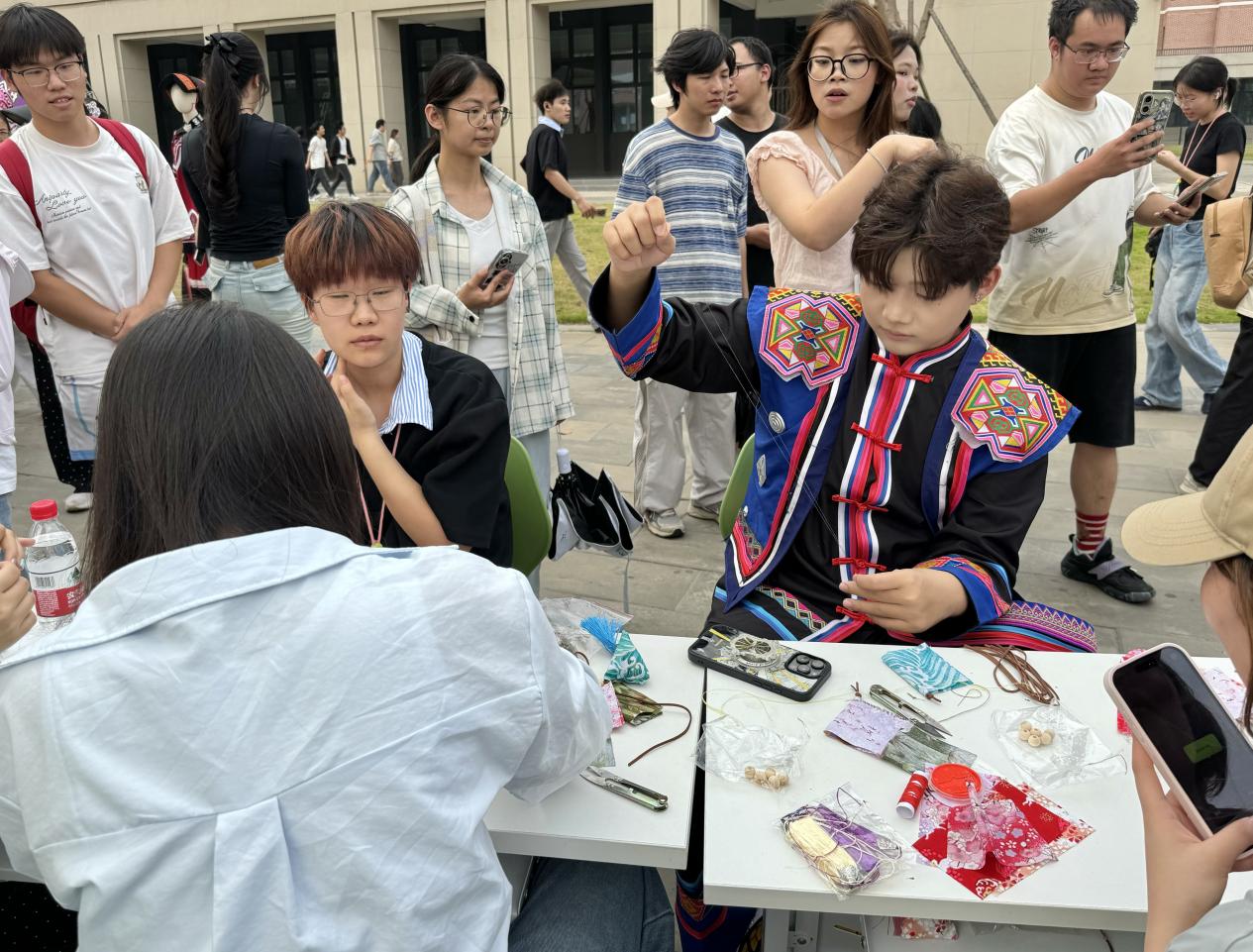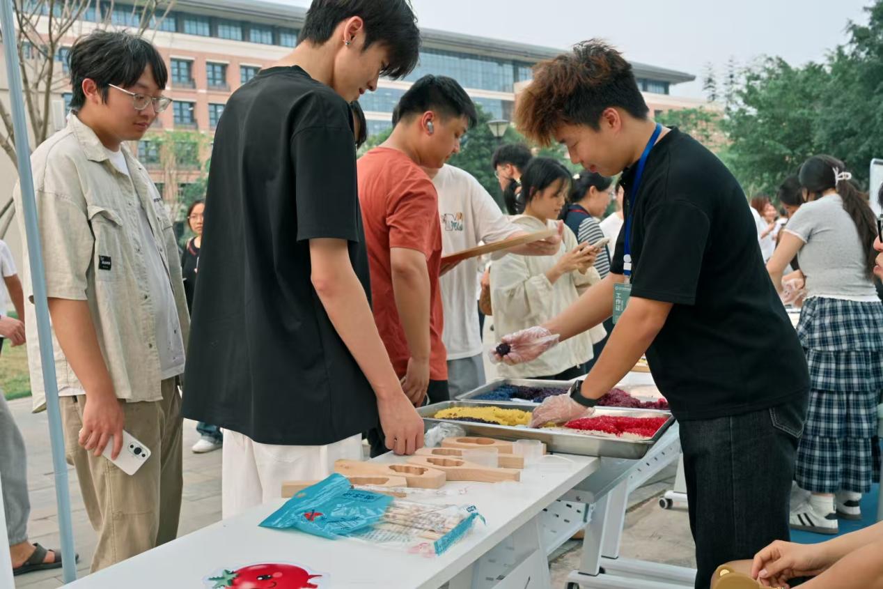 活动当天,学院在校园民俗长廊设立特色 DIY 体验摊位,面向全校师生开放五色糯米饭造型摆放、绣球与香囊制作等互动项目。学子们化身 "文化小导师",耐心引导师生体验传统工艺、指导手工制作;同步在艺术岛与静听湖连廊间举办学生艺术作品展,将民俗体验与艺术创作有机融合。此次校内实践,不仅让师生近距离感受壮乡民俗的独特魅力,更有效锤炼了艺传学子的动手实践、组织协调与沟通表达能力,为后续校外实践积累了宝贵经验。